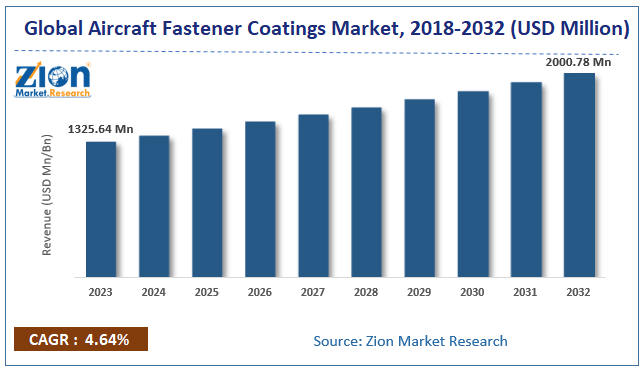 Zion Market Research has published a new report titled “Aircraft Fastener Coatings Market By Aircraft Type (Commercial, Regional, General Aviation, Helicopter, And Military), By Application (Engine, Aerostructures, Interiors, And Others), By Coating Type (Cadmium Coating, Dry Lubricant, Silver Coating, Aluminum Coating, And Others), And By Process Type (Spray Coating, Dip Coating, Electroplating, And Others), And By Region - Global And Regional Industry Overview, Market Intelligence, Comprehensive Analysis, Historical Data, And Forecasts 2024–2032. According to the report, the global aircraft fastener coatings market was approximately USD 1325.64 million in 2023 and is expected to generate around USD 2000.78 million by 2032, at a CAGR of around 4.64% between 2024 and 2032.