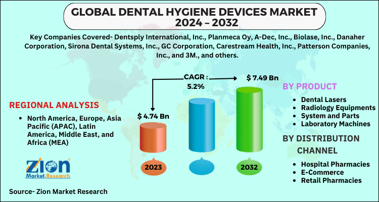 Zion Market Research has published a new report titled “Dental Hygiene Devices Market By Product (Dental Lasers, Radiology Equipments, System and Parts, Laboratory Machines, Hygiene Maintenance Devices, and Other Equipments), By Distribution Channel (Hospital Pharmacies, E-Commerce, Retail Pharmacies, Others), and By Region: Global Industry Perspective, Comprehensive Analysis and Forecast, 2024 - 2032”. According to the report, the global dental hygiene devices market size was valued at approximately USD 4.74 billion in 2023 and is predicted to reach around USD 7.49 billion by the end of 2032, expanding at a CAGR of around 5.2% from 2024 to 2032.