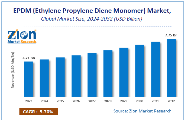 Zion Market Research has published a new report titled “EPDM (Ethylene Propylene Diene Monomer) Market By Application (Automotive, Building & Construction, Tires & Tubes, Wires & Cables, Lubricant Additives, and Others), By Region - Global And Regional Industry Overview, Market Intelligence, Comprehensive Analysis, Historical Data, And Forecasts 2024 – 2032”. According to the report, the global EPDM (Ethylene Propylene Diene Monomer) market was approximately USD 4.71 Billion in 2023 and is predicted to grow to around USD 7.75 Billion by 2032 with a compound annual growth rate (CAGR) of roughly 5.70% between 2024 and 2032.