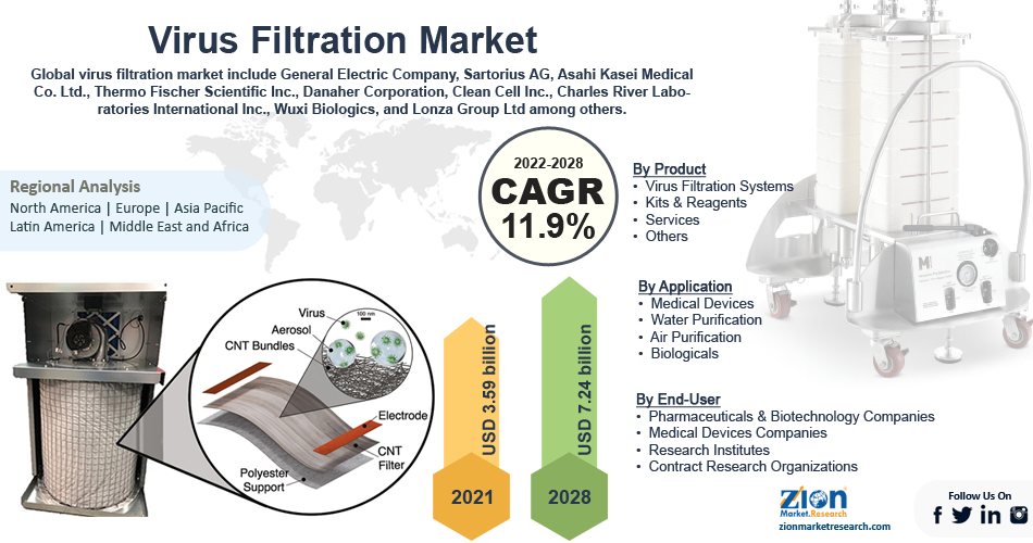 Key players functioning in the global virus filtration market include General Electric Company, Sartorius AG, Thermo Fischer Scientific Inc., Danaher Corporation, Clean Cell Inc., Charles River Laboratories International Inc., Wuxi Biologics, Lonza Group Ltd., and Asahi Kasei Medical Co. Ltd. among others.