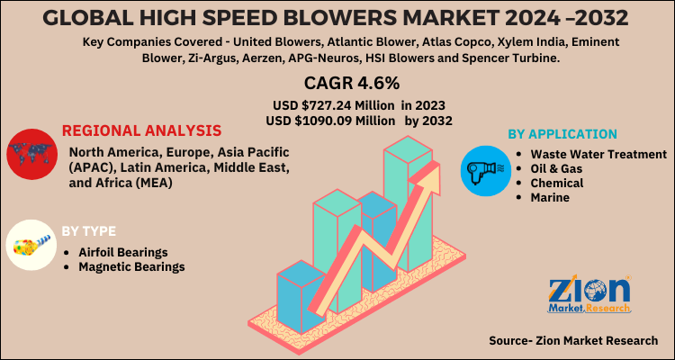Zion Market Research has published a new report titled “High Speed Blowers Market Report by Type (Airfoil Bearings, Magnetic Bearings), by Application (Waste Water Treatment, Oil & Gas, Chemical, and Marine): Global Industry Perspective, Comprehensive Analysis, and Forecast, 2024 – 2032.”According to the report, the High Speed Blowers Market accounted for USD 727.24 Million in 2023 and is expected to reach USD1090.09 Million by 2032, growing at a CAGR of around 4.6% between 2024 and 2032.