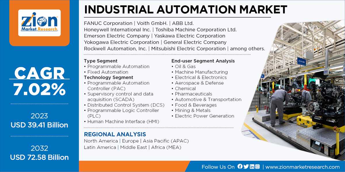 Browse the full "Industrial Automation Market by Type (Programmable Automation and Fixed Automation), by Technology (Programmable Automation Controller (PAC), Supervisory control and data acquisition (SCADA), Distributed Control System (DCS), Programmable Logic Controller (PLC), Human Machine Interface (HMI)), and by End-user (Oil & Gas, Machine Manufacturing, Electrical & Electronics, Aerospace & Defense, Chemical, Pharmaceuticals, Automotive & Transportation, Food & Beverages, Mining & Metals, and Electric Power Generation): Global Industry Perspective, Comprehensive Analysis, and Forecast, 2024 - 2032" report at https://www.zionmarketresearch.com/report/industrial-automation-market
