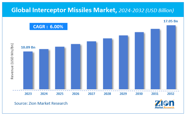 Zion Market Research has published a new report titled “Global Interceptor Missiles Market –By Surface (Water To Air and Surface To Air), By Range (Long Range, Medium Range, and Short Range), By Component (Global Positioning System (GPS), Radar Homing, Infrared, Semi-Active Lasers, Inertial Navigation System (INS), and Others), and By Region: Global Industry Perspective, Comprehensive Analysis, and Forecast, 2024 – 2032.” According to the report, the global demand for the interceptor missiles market was valued at around USD 10.09 Billion in 2023 and is expected to propel at a CAGR of nearly 6% between 2020 and 2025.