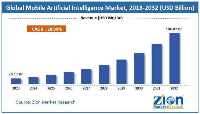 Zion Market Research has published a new report titled “Mobile Artificial Intelligence (AI) Market by Technology Node (5nm-10nm, 11nm-20nm, and Above 20nm), by Application (Cameras, Smartphones, Vehicles, Robots, AR/VR Devices, and Others), and by End-Use Industry (Consumer Electronics, Automotive, Robotics, and Others): Global Industry Perspective, Comprehensive Analysis, and Forecast, 2017 – 2024”. According to the report, the global mobile artificial intelligence (AI) market accounted for USD 3.9 billion in 2017 and is expected to reach USD 22.4 billion globally by 2024, at a CAGR of 28.4% between 2018 and 2024.