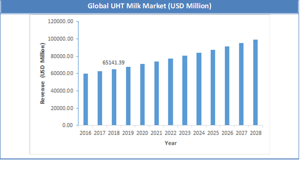 According to analysts at Zion Market Research, the global UHT milk market accounted for USD 70,864 Million in 2020 and is expected to reach USD 98,958 Million by 2028, growing at a CAGR of 4.3% from 2021 to 2028.