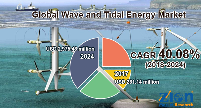 Zion Market Research has published a new report titled “Wave and Tidal Energy Market by Type (Tidal Energy, Wave Energy) by Technology (Tidal Steam Generator, Pendulor Device, Oscillating Water Columns, Barrage, Others), and by End-User (Residential, Commercial, Industrial): Global Industry Perspective, Comprehensive Analysis and Forecast, 2017 - 2024”. According to the report, global wave and tidal energy market was valued at approximately USD 281.14 million in 2017 and is expected to generate revenue of around USD 2,975.48 million by the end of 2024, growing at a CAGR of around 40.08% between 2018 and 2024.
