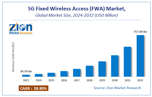 The global 5G Fixed Wireless Access (FWA) market size was worth around USD 39.59 Billion in 2023 and is predicted to grow to around USD 757.00 Billion by 2032 with a compound annual growth rate (CAGR) of roughly 38.8%? between 2023 and 2032. The report covers a forecast and an analysis of the 5G fixed wireless access (FWA) market on a global and regional level. The study provides data from 2023 to 2032 based on revenue (USD Million).