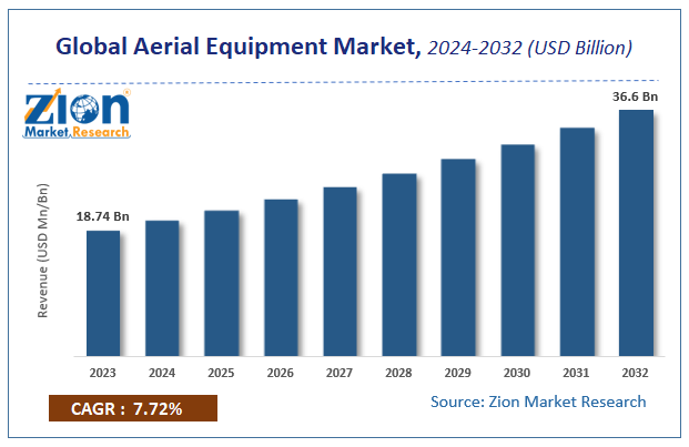 According to Zion Market Research, the global Aerial Equipment Market was worth USD 18.74 Billion in 2023. The market is forecast to reach USD 36.6 Billion by 2032, growing at a compound annual growth rate (CAGR) of 7.72% during the forecast period 2024-2032.