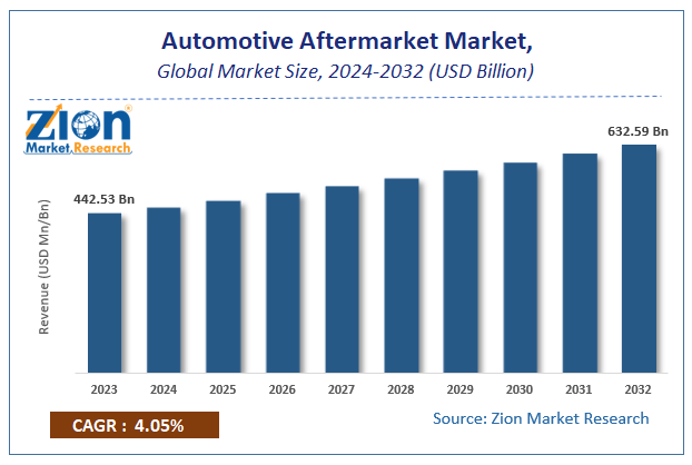 Zion Market Research has published a report on the global Automotive Aftermarket Market, estimating its value at USD 442.53 Billion in 2023, with projections indicating that it will reach USD 632.59 Billion by 2032. The market is expected to expand at a compound annual growth rate (CAGR) of 4.05% over the forecast period 2024-2032.
