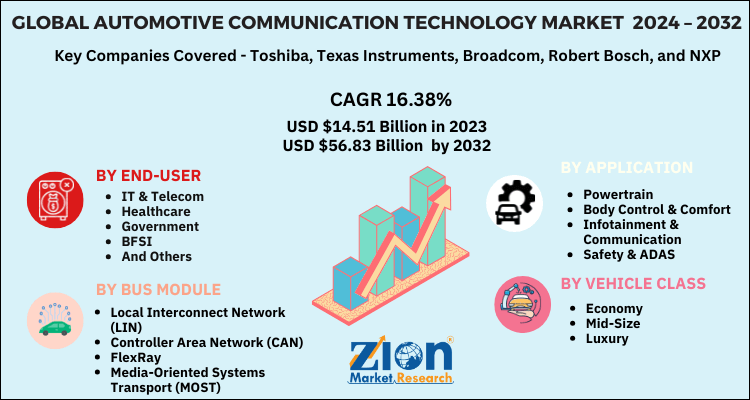 According to a report from Zion Market Research, the global Automotive Communication Technology Market was valued at USD 14.51 Billion in 2023 and is projected to hit USD 56.83 Billion by 2032, with a compound annual growth rate (CAGR) of 16.38% during the forecast period 2024-2032. This report explores market strengths, weakness, opportunities, and threats. It also provides valuable insights into the market's growth drivers, challenges, and the future prospects that may emerge in the Automotive Communication Technology industry over the next decade.