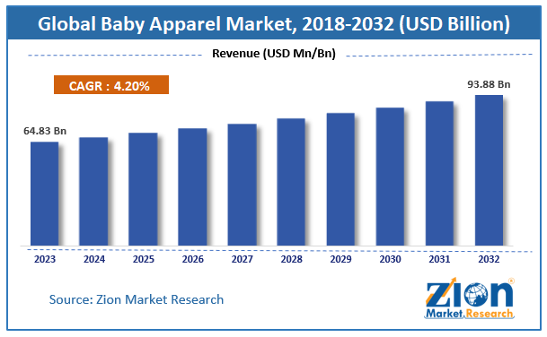 According to the report published by Zion Market Research, the global Baby Apparel Market size was valued at USD 64.83 Billion in 2023 and is predicted to reach USD 93.88 B Million by the end of 2032. The market is expected to grow with a CAGR of 4.20% during the forecast period. The report analyzes the global Baby Apparel Market’s growth drivers, restraints, and impact on demand during the forecast period. It will also help navigate and explore the arising opportunities in the Baby Apparel Market industry.