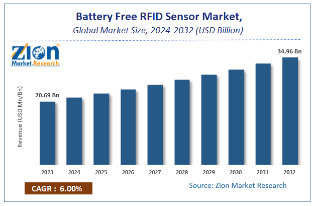 According to the report published by Zion Market Research, the global Battery Free RFID Sensor Market size was valued at USD 20.69 Billion in 2023 and is predicted to reach USD 34.96 Billion by the end of 2032. The market is expected to grow with a CAGR of 6% during the forecast period. The report analyzes the global Battery Free RFID Sensor Market's growth drivers, restraints, and impact on demand during the forecast period. It will also help navigate and explore the arising opportunities in the Battery Free RFID Sensor industry.