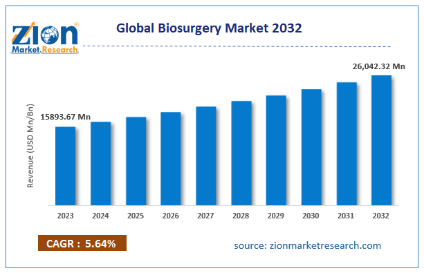 The global biosurgery market size and share revenue accrued earnings worth approximately USD 15893.67 Million in 2023 and is predicted to gain revenue of about USD 26,042.32 Million by 2032, is set to record a CAGR of nearly 5.64% over the period from 2024 to 2032.