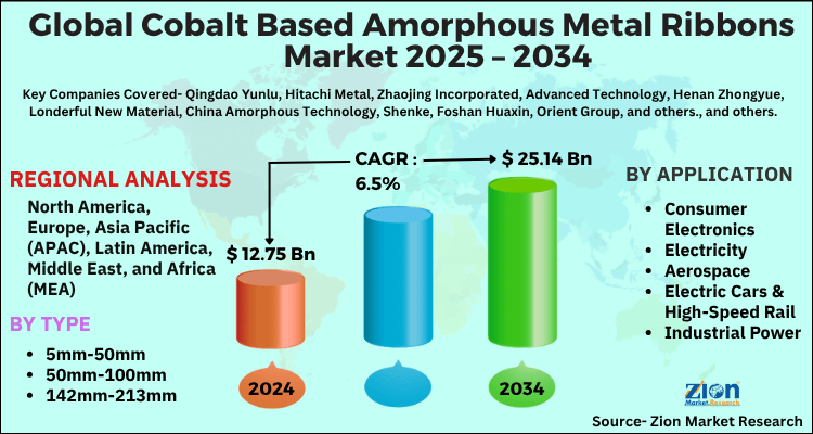 The global cobalt based amorphous metal ribbons market size was worth around USD 12.75 Billion in 2024 and is predicted to grow to around USD 25.14 Billion by 2034 with a compound annual growth rate (CAGR) of roughly 6.5% between 2025 and 2034.