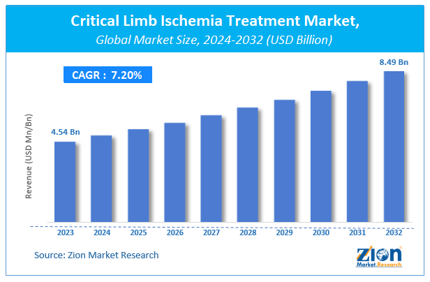 The global Critical Limb Ischemia Treatment Market size was worth around USD 4.54 billion in 2023 and is predicted to grow to around USD 8.49 billion by 2032 with a compound annual growth rate (CAGR) of roughly 7.2% between 2024 and 2032.