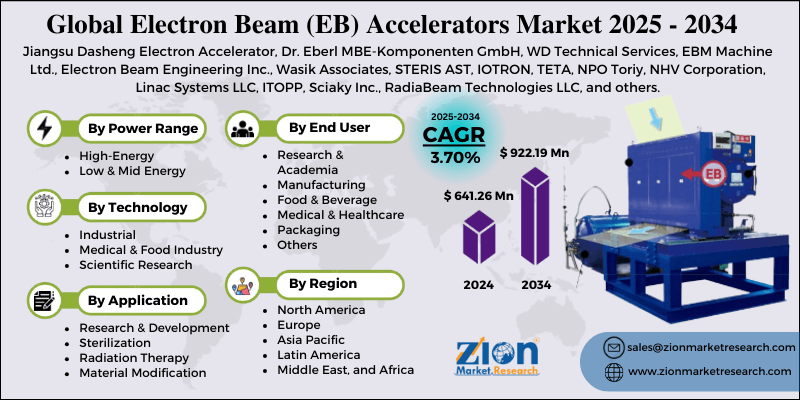 The global electron beam (EB) accelerators market size was worth around USD 641.26 million in 2024 and is predicted to grow to around USD 922.19 million by 2034, with a compound annual growth rate (CAGR) of roughly 3.70% between 2025 and 2034.