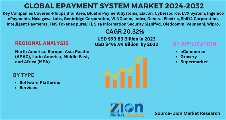 According to a report from Zion Market Research, the global ePayment System Market was valued at USD 93.85 Billion in 2023 and is projected to hit USD 495.99 Billion by 2032, with a compound annual growth rate (CAGR) of 20.32% during the forecast period 2024-2032.