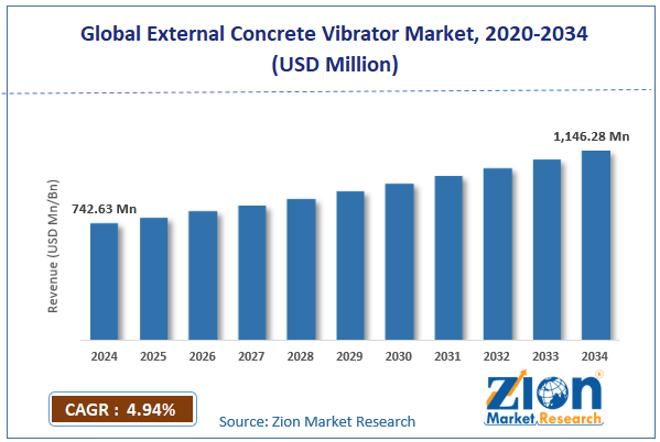 The global external concrete vibrator market size was worth approximately USD 742.63 million in 2024 and is projected to grow to around USD 1,146.28 million by 2034, with a compound annual growth rate (CAGR) of roughly 4.94% between 2025 and 2034.