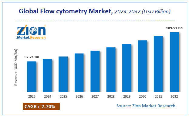 According to Zion Market Research, the global Flow cytometry Market was worth USD 97.21 Billion in 2023. The market is forecast to reach USD 189.51 Billion by 2032, growing at a compound annual growth rate (CAGR) of 7.7% during the forecast period 2024-2032.