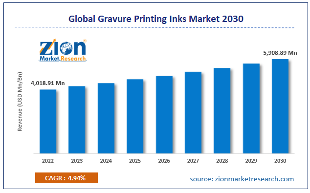 According to the report published by Zion Market Research, the global Gravure Printing Inks Market size was valued at USD 4,018.91 Million in 2022 and is predicted to reach USD 5,908.89 Million by the end of 2030. The market is expected to grow with a CAGR of 4.94% during the forecast period. The report analyzes the global Gravure Printing Inks Market’s growth drivers, restraints, and impact on demand during the forecast period. It will also help navigate and explore the arising opportunities in the Gravure Printing Inks Market industry.