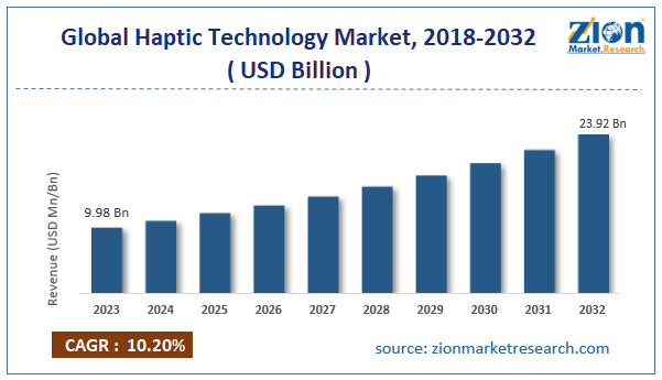 The global haptic technology market size was worth around USD 9.98 billion in 2023 and is predicted to grow to around USD 23.92 billion by 2032 with a compound annual growth rate (CAGR) of roughly 10.2% between 2024 and 2032.