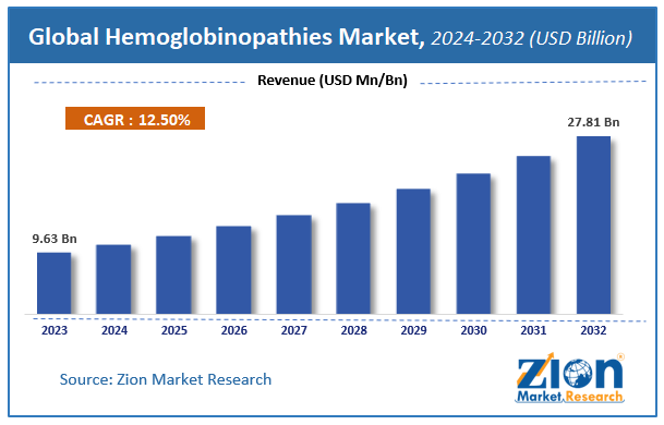 The global Hemoglobinopathies Market size was valued at USD 9.63 Billion in 2023 and is predicted to reach USD 27.81 Billion by the end of 2032. The market is expected to grow with a CAGR of 12.5% during the forecast period. The report analyzes the global Hemoglobinopathies Market's growth drivers, restraints, and impact on demand during the forecast period. It will also help navigate and explore the arising opportunities in the Hemoglobinopathies industry.