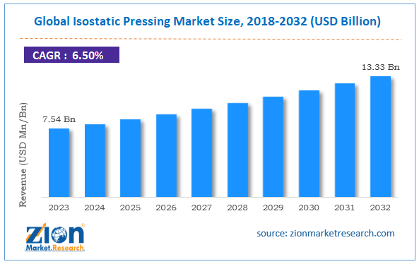 The global isostatic pressing market size was evaluated at $7.54 billion in 2023 and is slated to hit $13.33 billion by the end of 2032 with a CAGR of nearly 6.5% between 2024 and 2032.