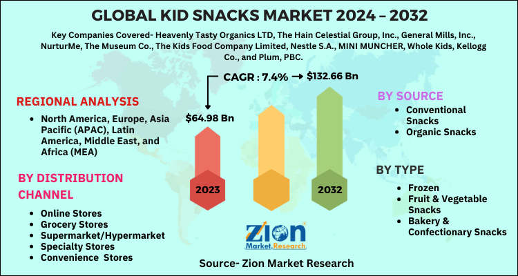 According to Zion market research report, the global Kid Snacks market accrued earnings worth approximately 64.98(USD Billion) in 2024 and is predicted to gain revenue of about 132.66 (USD Billion) by 2032, is set to record a CAGR of nearly 7.4% over the period from 2024 to 2032.
