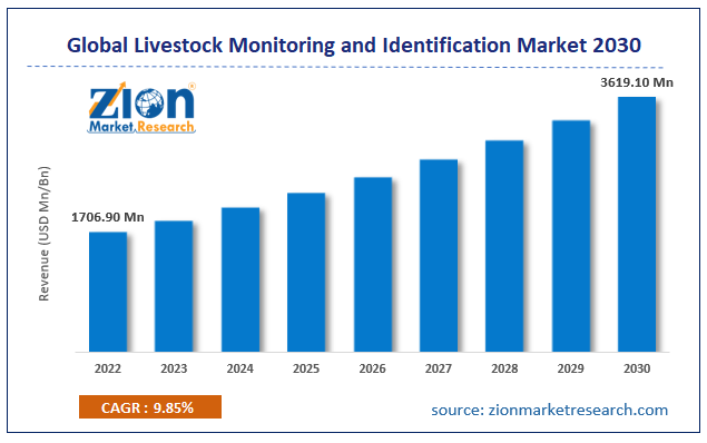 According to the report published by Zion Market Research, the global Livestock Monitoring and Identification Market size was valued at USD 1,706.90 Million in 2022 and is predicted to reach USD 3,619.10 Million by the end of 2030. The market is expected to grow with a CAGR of 9.85% during the forecast period. The report analyzes the global Livestock Monitoring and Identification Market’s growth drivers, restraints, and impact on demand during the forecast period. It will also help navigate and explore the arising opportunities in the Livestock Monitoring and Identification Market industry.