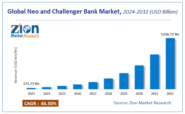 According to a report from Zion Market Research, the global Neo and Challenger Bank Market was valued at USD 171.73 Billion in 2023 and is projected to hit USD 5256.71 Billion by 2032, with a compound annual growth rate (CAGR) of 46.3% during the forecast period 2024-2032.