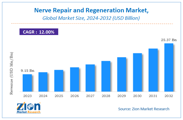 Global Nerve Repair and Regeneration market size earned around $9.15 Bn in 2023 and is expected to reach $25.37 Bn by 2032, with a projected CAGR of 12.0%.