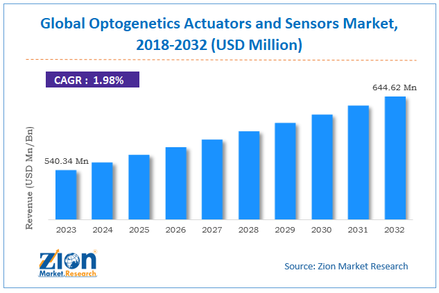 According to the report, global demand for Optogenetics Actuators and Sensors market was valued at approximately USD 540.34 million in 2023, and is expected to generate revenue of around USD 644.62 million by end of 2032, growing at a CAGR of around 1.98% between 2024 and 2032.