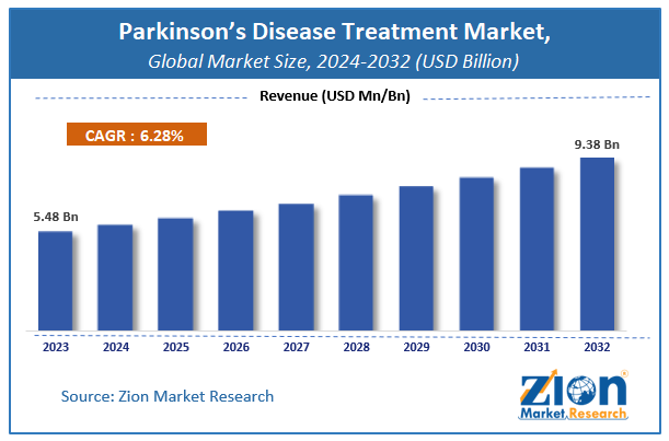 The global parkinson’s disease treatment market size was worth around USD 5.48 billion in 2023 and is predicted to grow to around USD 9.38 billion by 2032 with a compound annual growth rate (CAGR) of roughly 6.28% between 2024 and 2032.