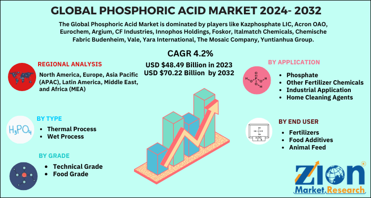According to a report from Zion Market Research, the global Phosphoric Acid Market was valued at USD 48.49 Billion in 2023 and is projected to hit USD 70.22 Billion by 2032, with a compound annual growth rate (CAGR) of 4.2% during the forecast period 2024-2032.