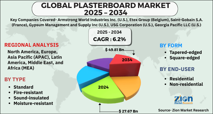 The global plasterboard market size was worth around USD 27.67 Billion in 2024 and is predicted to grow to around USD 49.81 Billion by 2034 with a compound annual growth rate (CAGR) of roughly 6.2% between 2025 and 2034. The report analyzes the global plasterboard market's drivers, restraints/challenges, and the effect they have on the demands during the projection period. In addition, the report explores emerging opportunities in the plasterboard industry.
