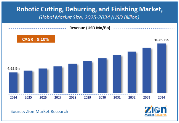 According to a study, the global robotic cutting, deburring, and finishing market size was worth around USD 4.62 Billion in 2024 and is expected to reach USD 10.89 Billion by 2034.