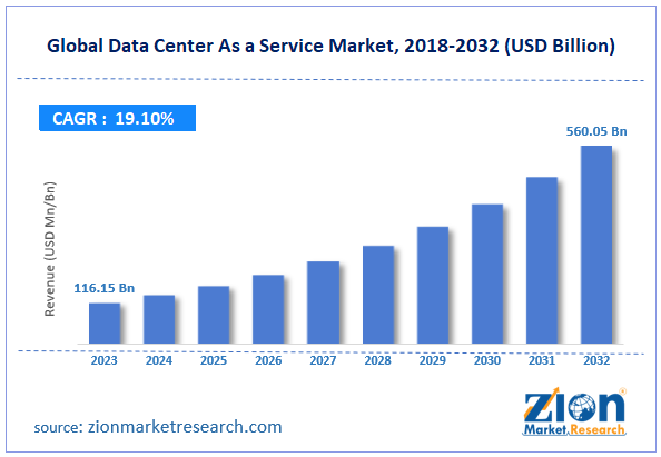 According to the report published by Zion Market Research, the global data center as a service market size was valued at USD 116.15 Billion in 2023 and is predicted to reach USD 560.05 Billion by the end of 2032. The market is expected to grow with a CAGR of 19.1% during the forecast period. The report analyzes the global Data Center As a Service Market's growth drivers, restraints, and impact on demand during the forecast period. It will also help navigate and explore the arising opportunities in the data center as a service market industry.