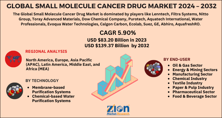 According to the report published by Zion Market Research, the global Small Molecule Cancer Drug Market size was valued at USD 83.20 Billion in 2023 and is predicted to reach USD 139.37 Billion by the end of 2032. The market is expected to grow with a CAGR of 5.90% during the forecast period. The report analyzes the global Small Molecule Cancer Drug Market's growth drivers, restraints, and impact on demand during the forecast period. It will also help navigate and explore the arising opportunities in the Small Molecule Cancer Drug industry.