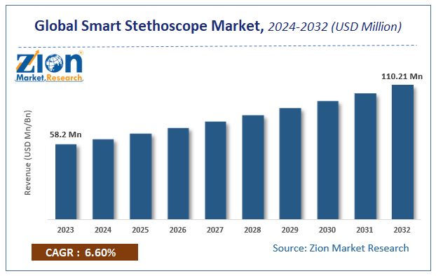 According to a report from Zion Market Research, the global Smart Stethoscope Market was valued at USD 58.2 Million in 2023 and is projected to hit USD 110.21 Million by 2032, with a compound annual growth rate (CAGR) of 6.6% during the forecast period 2024-2032.