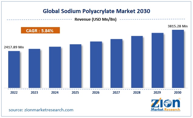 According to the report published by Zion Market Research, the global Sodium Polyacrylate Market size was valued at USD 2417.89 Million in 2022 and is predicted to reach USD 3815.28 Million by the end of 2030. The market is expected to grow with a CAGR of 5.84% during the forecast period. The report analyzes the global Sodium Polyacrylate Market’s growth drivers, restraints, and impact on demand during the forecast period. It will also help navigate and explore the arising opportunities in the Sodium Polyacrylate Market industry.