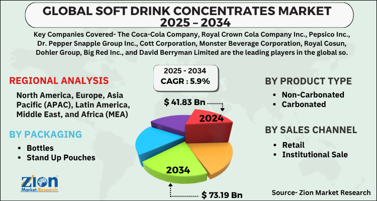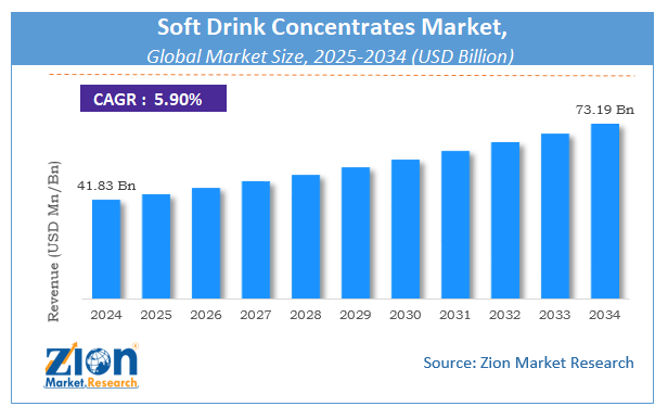 The global soft drink concentrates market size was worth around USD 41.83 Billion in 2024 and is predicted to grow to around USD 73.19 Billion by 2034 with a compound annual growth rate (CAGR) of roughly 5.9% between 2025 and 2034. The report analyzes the global soft drink concentrates market's drivers, restraints/challenges, and the effect they have on the demands during the projection period. In addition, the report explores emerging opportunities in the soft drink concentrates industry.