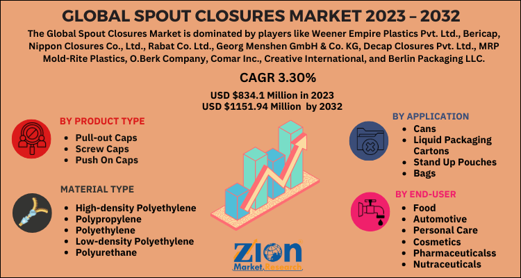 The global spout closures market had a value of USD 834.1 Million in 2023, and according to Zion Market Research, it will grow to USD 1151.94 Million by the end of 2032. The market is expected to grow with a CAGR of 3.30% during the forecast period.