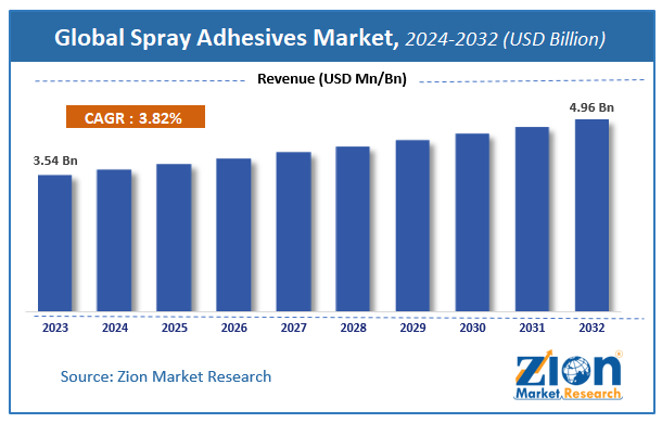 According to Zion Market Research, the global Spray Adhesives Market was worth USD 3.54 Billion in 2023. The market is forecast to reach USD 4.96 Billion by 2032, growing at a compound annual growth rate (CAGR) of 3.82% during the forecast period 2024-2032.