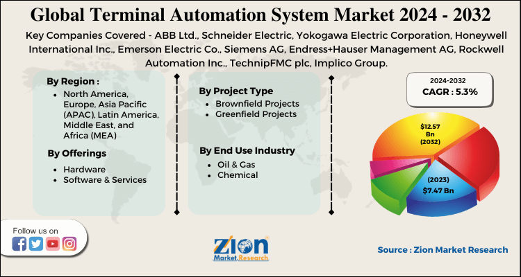 Zion Market Research has published a report on the global Terminal Automation System Market, estimating its value at USD 7.47 Billion in 2023, with projections indicating that it will reach USD 12.57 Billion by 2032. The market is expected to expand at a compound annual growth rate (CAGR) of 5.3% over the forecast period 2024-2032. The report explores the factors fueling market growth, the hitches that could hamper this expansion, and the opportunities that may arise in the Terminal Automation System Market industry. Additionally, it offers a detailed analysis of how these elements will affect market demand dynamics and market performance throughout the forecast period.
