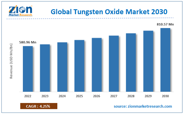 According to the report published by Zion Market Research, the global Tungsten Oxide Market size was valued at USD 580.96 Million in 2022 and is predicted to reach USD 810.57 Million by the end of 2030. The market is expected to grow with a CAGR of 4.25% during the forecast period. The report analyzes the global Tungsten Oxide Market’s growth drivers, restraints, and impact on demand during the forecast period. It will also help navigate and explore the arising opportunities in the Tungsten Oxide Market industry.