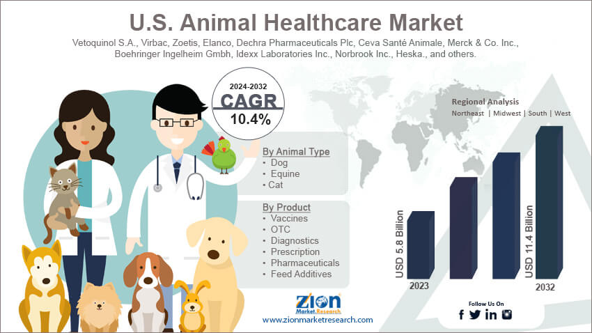 According to a study, the global U.S. animal healthcare industry size was $5.8 billion in 2023 and is projected to reach $11.4 billion by the end of 2032.
