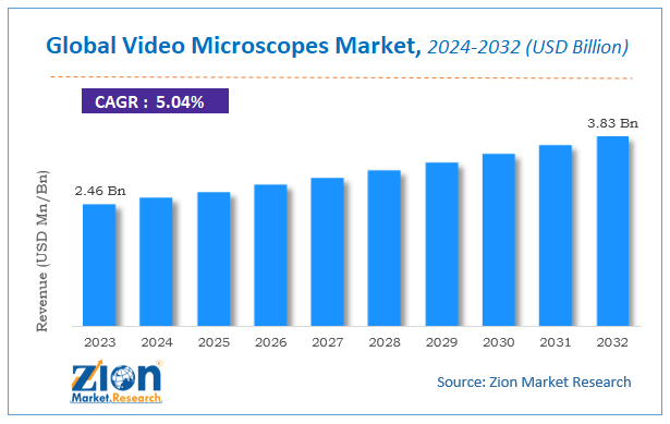 The global video microscopes market size was worth around USD 2.46 billion in 2023 and is predicted to grow to around USD 3.83 billion by 2032 with a compound annual growth rate (CAGR) of roughly 5.04% between 2024 and 2032.