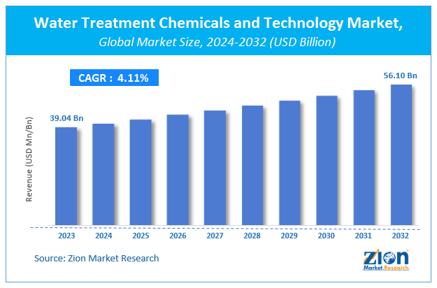 According to Zion Market Research, the global Water Treatment Chemicals and Technology Market, estimating its value at USD 39.04 Billion in 2023, with projections indicating that it will reach USD 56.10 Billion by 2032. The market is expected to expand at a compound annual growth rate (CAGR) of 4.11% over the forecast period 2024-2032.