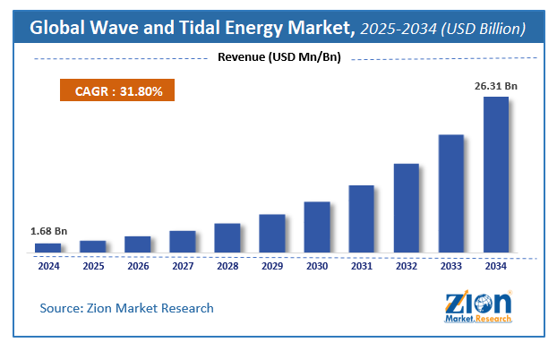 The global wave and tidal energy market size was worth around USD 1.68 Billion in 2024 and is predicted to grow to around USD 26.31 Billion by 2034 with a compound annual growth rate (CAGR) of roughly 31.8% between 2025 and 2034. The report analyzes the global wave and tidal energy market's drivers, restraints/challenges, and the effect they have on the demands during the projection period. In addition, the report explores emerging opportunities in the wave and tidal energy industry.