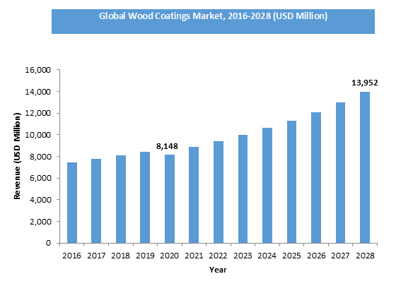The wood coating is a kind of material applied to the surface to protect the wood from external factors. It helps in increasing the product life. Also, the use of wood coating increases the visual cues of wooden objects, thereby helping in the marketing of the product.